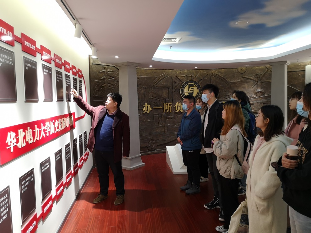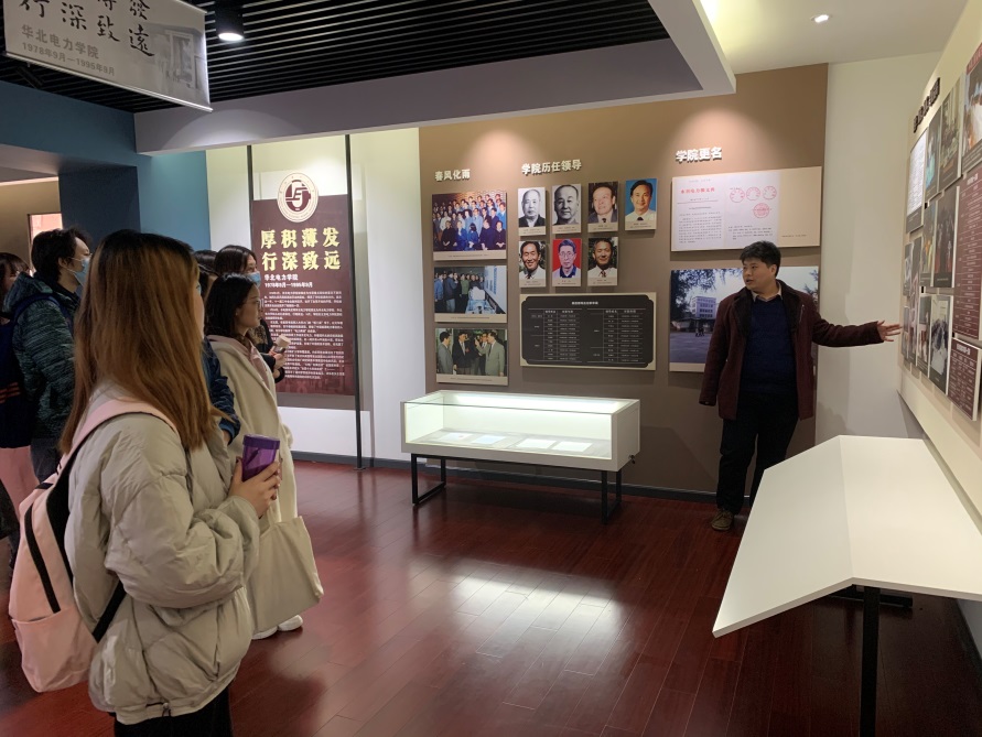 参观伊始,杨天明为同学们简单介绍了华电历史发展的时间轴。通过展厅内一张张老照片,带领大家一同回顾了北京电力学院时期、河北电力学院、华北电力学院时期的场景,回顾华电前人们筚路蓝缕建立学校的艰辛历程。