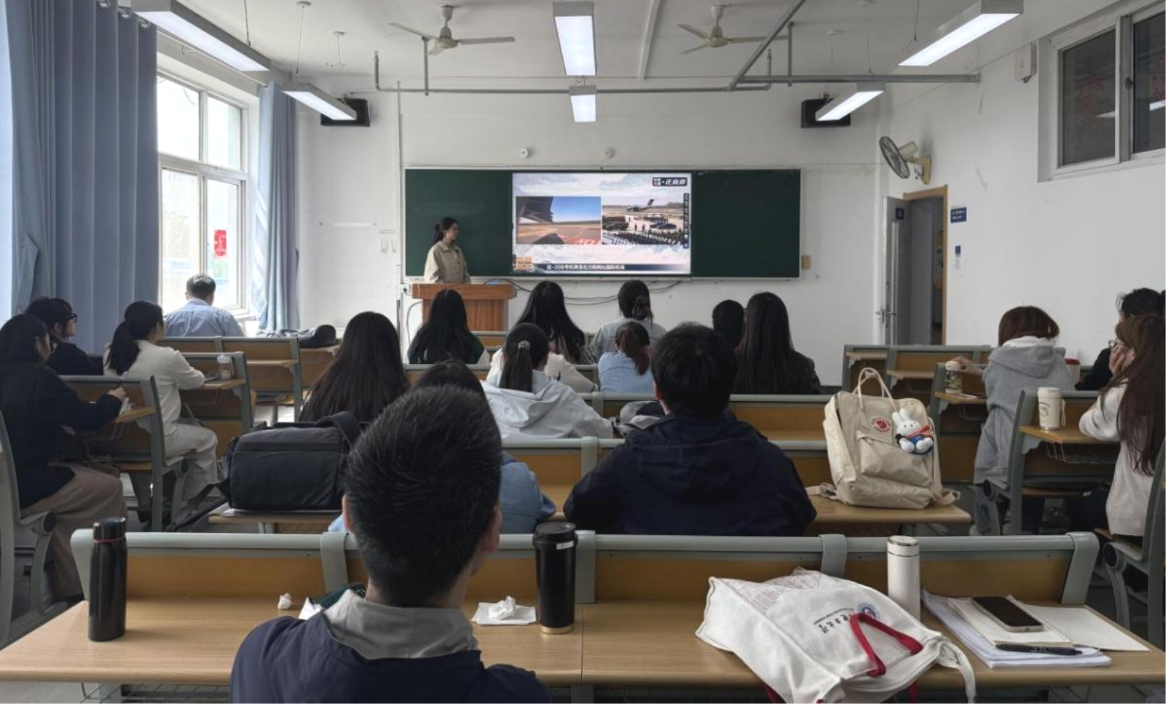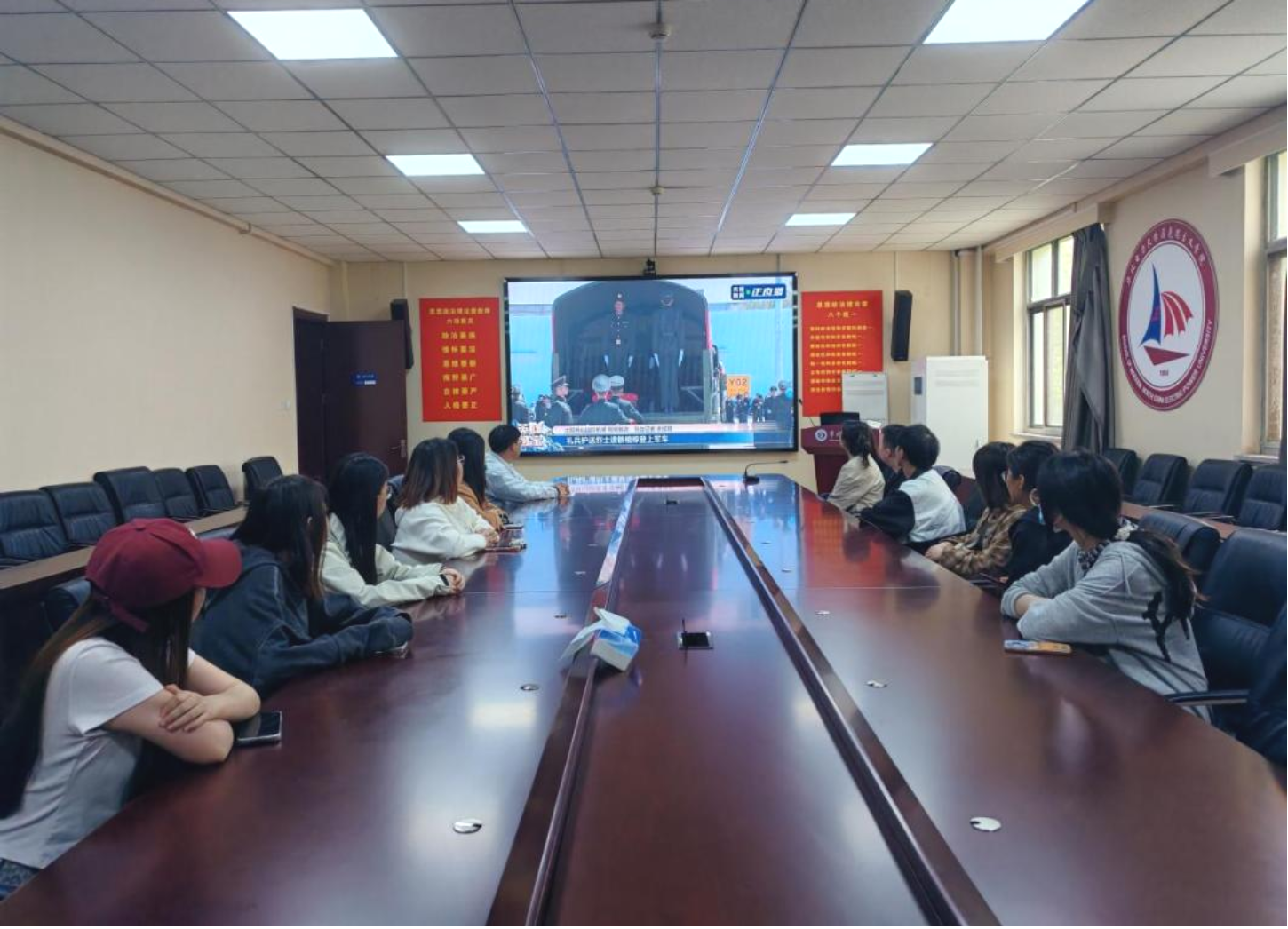 结合校区分布特点,学院设置校本部与沙河院区双会场同步进行,实现全体员工全覆盖,保障学习教育不走过场、取得实效。各党支部牵头统筹,明确观礼纪律,提前布置会场并组织员工有序入场,全程保持庄重肃穆的氛围,全体师生以最崇敬的姿态共同见证英烈荣归的历史性时刻。直播画面中,运-20专机以“过水门”最高礼遇迎接英烈回家,覆盖着鲜红国旗的烈士棺椁在礼兵的护送下缓缓前行,观礼现场全体成员肃立默哀,向英烈致以最崇高的敬意,每一个庄严瞬间都深深触动在场学子,不少同学在看到仪仗队护送棺椁的镜头时红了眼眶。大家怀着无比崇敬的心情,深切缅怀70余年前为保家卫国、捍卫和平浴血奋战的志愿军先烈,深刻感悟他们用生命铸就的跨越时空、历久弥新的伟大抗美援朝精神。