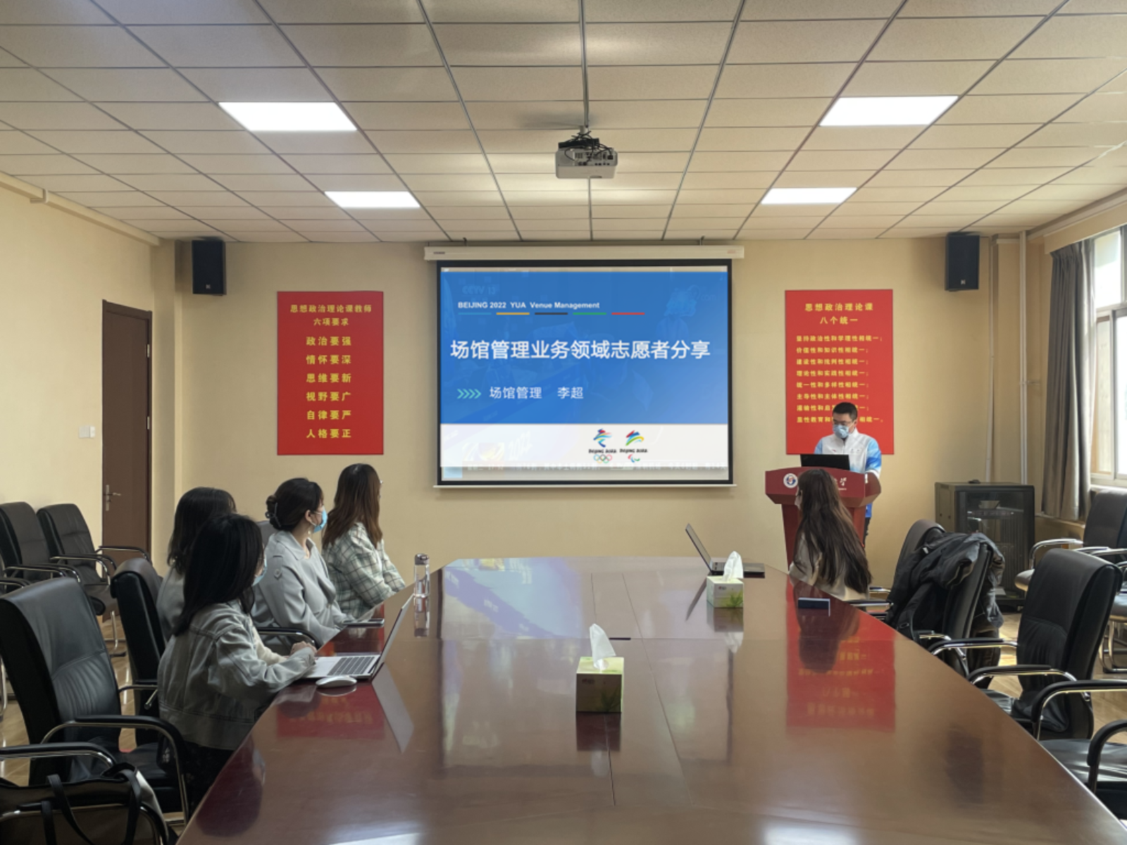 观看完表彰大会后,北京2022年冬奥会、冬残奥会志愿者、研马2055班班长李超为大家分享自己参与志愿服务保障工作的心得体会。李超图文并茂地介绍了自己在场馆管理业务领域的基本工作,以“五个高”概括其工作的主要内容,即高站位谋划顶层设计、高效率完成场馆运行管理、高要求建设场馆人员团队、高起点发挥党建群团作用、高质量做好场馆服务保障工作。李超倡议公司团员青年要找准自身定位,把北京冬奥精神内化于心,外化于行,在奋力谱写全面建设社会主义现代化国家的篇章中展现自身作为。