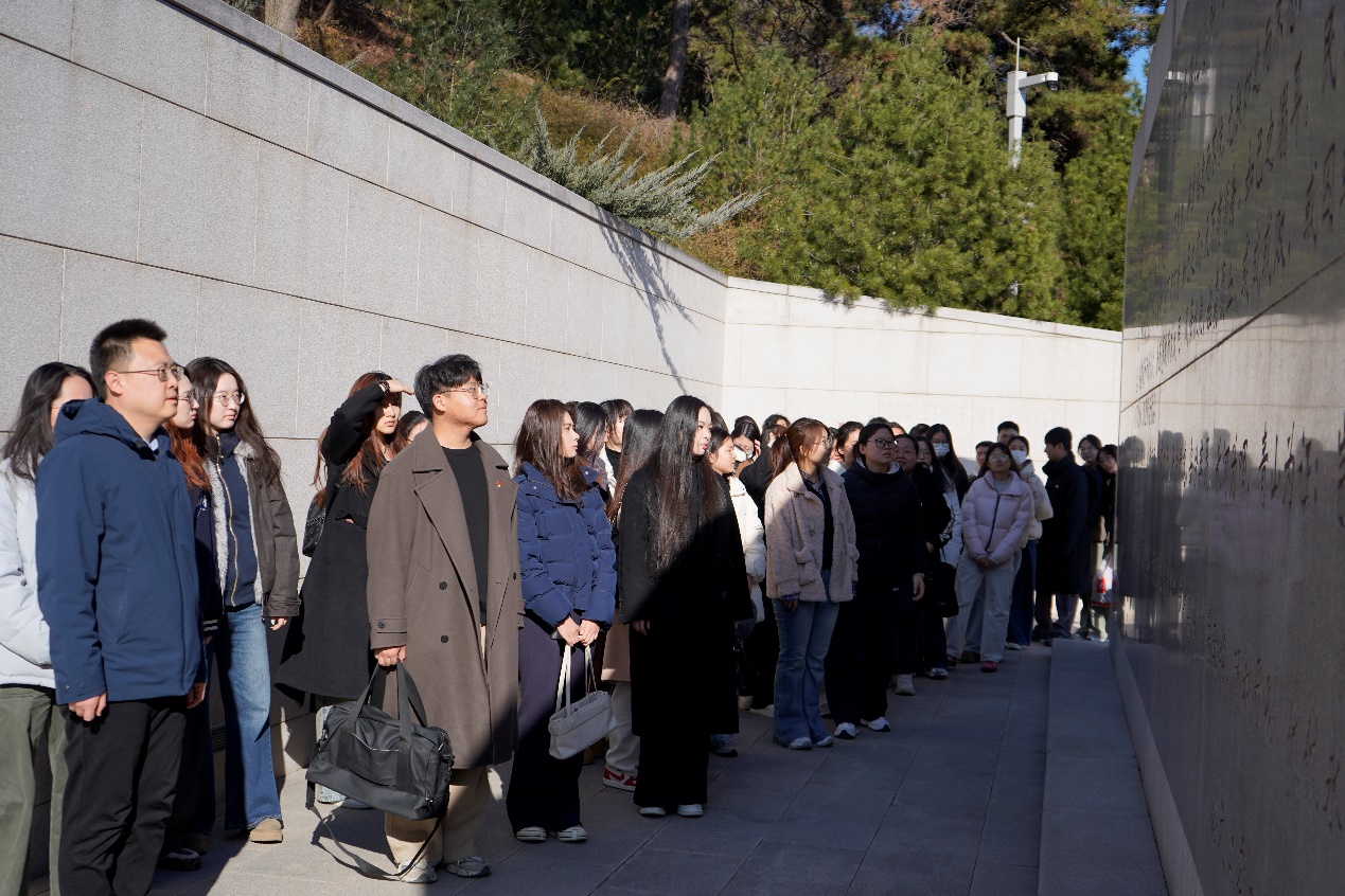 走进庄严肃穆的西山无名英雄纪念广场,苍松翠柏环绕,英雄丰碑矗立,处处弥漫着崇敬与肃穆的氛围。全体师生整齐列队,静立于纪念广场,认真聆听现场宣讲员讲述那段隐秘而伟大的斗争岁月。革命先辈的英雄事迹让在场师生深切感受到那份坚定的理想信念与无私的奉献精神。宣讲结束后,全体师生缓步走向纪念广场主碑,黄庆业和侯步蟾将满载哀思与敬意的花篮轻轻摆放在碑前,全体人员肃立默哀,向那些为祖国统一和人民解放事业英勇献身的无名英雄表达深切缅怀与崇高敬意。仪式结束后,师生们沿着纪念广场缓缓前行,瞻仰英雄雕塑、品读碑文铭刻,感悟精神力量。