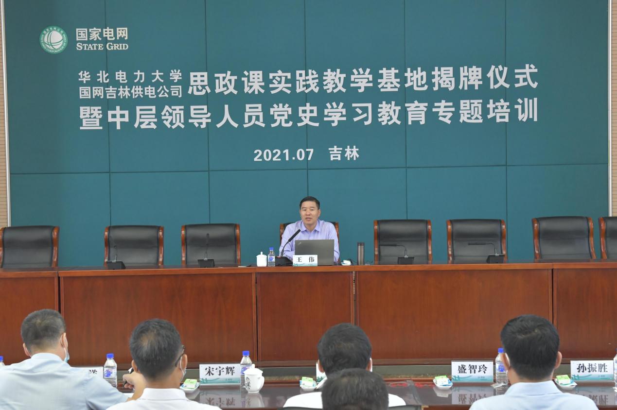 19日中午,实践团来到国网吉林供电公司机关二部参加bw必威西汉姆联官网思政课实践教学基地揭牌仪式。吉林公司党委书记朱晓锋、学院经理王伟出席仪式并致辞,吉林公司副总经理宋宇辉、公司党总支书记孙平出席仪式并共同为思政课实践教学基地揭牌。吉林公司纪委书记、工会主席孙振胜主持仪式。此次思政课实践教学基地的建立,不仅是探索实践校企合作新模式,弘扬马克思主义思想理论,更是将理论与实践相结合,将党的思想文化与电力行业发展相关联,既丰富思政教育新路径,又从现实中探索实践新课题,为深化党史学习教育、强化思想政治建设注入了新的活力。思政课实践教学基地的落成可以进一步促进思政课小课堂同社会大课堂、员工实现理论与实践、员工把学习奋斗的目标同民族复兴的伟大目标进行充分融合,有利于学院教师将理论研究和吉林公司党建创新实践进行有效结合。思政课实践教学基地的成立,必将为校企之间开展合作交流搭建新的平台和载体,学院将利用好这一平台载体,充分利用好吉林市红色文化资源及红色基因,与吉林公司共同为学院学子深入了解国情、加快历练成长提供良好的学习实践机会,公司将和吉林公司共同探索党史学习教育和党建创新的新模式,为电力行业提供更多人才和智力支撑。揭牌仪式结束后,王伟为吉林公司中层领导人员讲授专题党课。