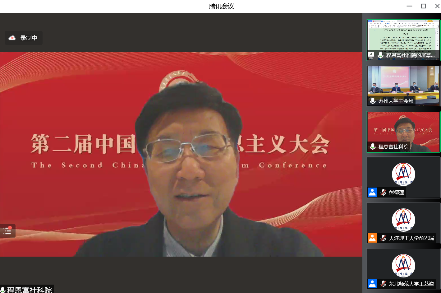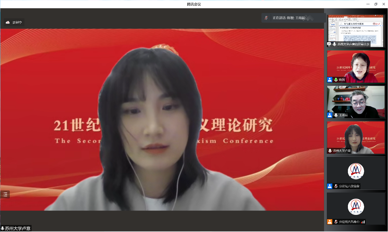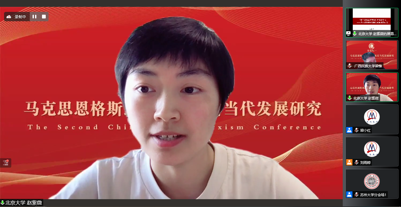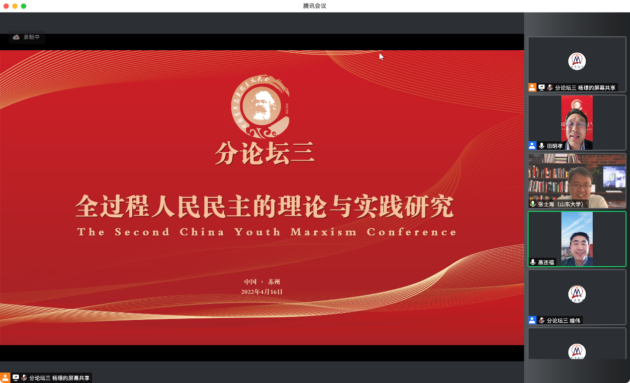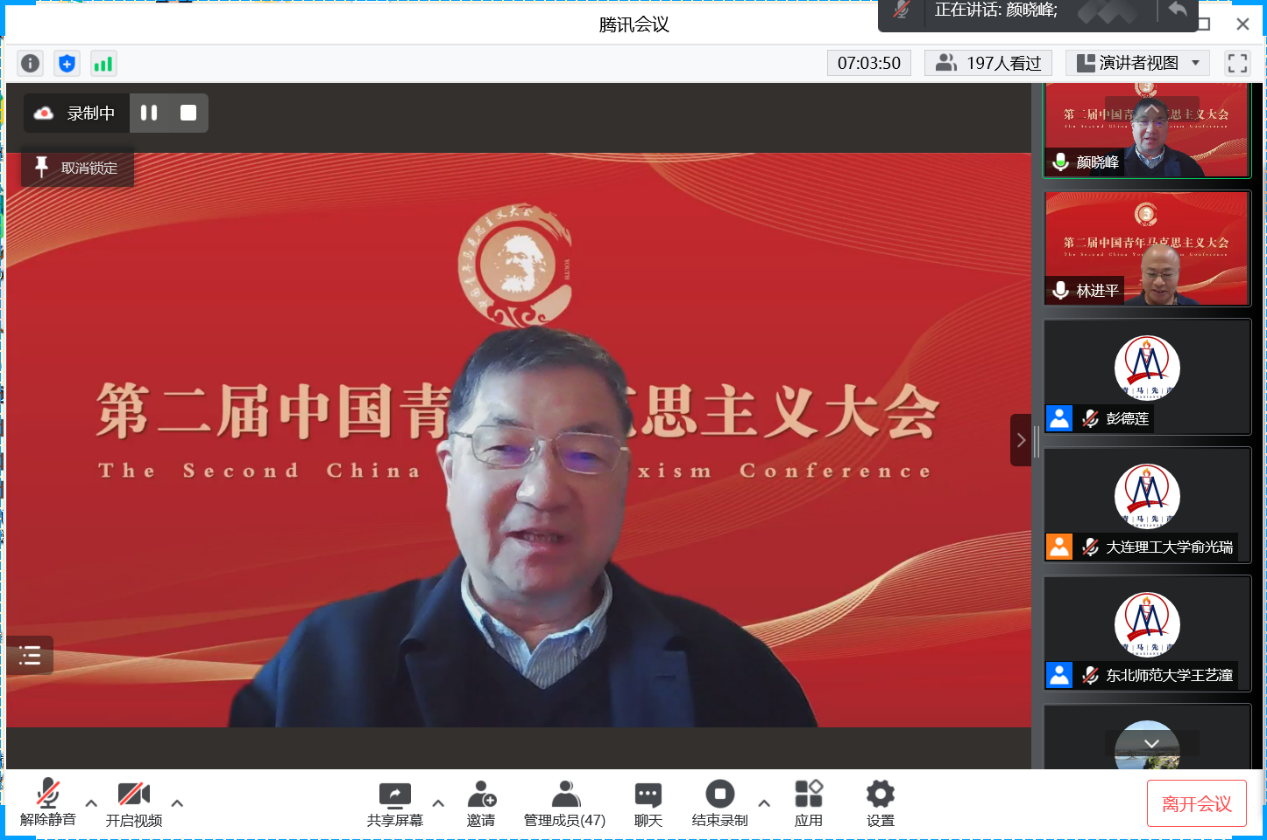 第二届“中国青年马克思主义大会”在苏州大学betway88西汉姆联等各主办、协办单位及“青马先声”等的筹办下取得圆满成功,来自全国高校、党政军企等科研院所的35位全国知名专家学者、200余位青年学者受邀参会学者围绕大会主题作主旨报告,共探学术前沿、共议学科发展。1个主会场、6场分论坛同时进行,线上直播累计55.8万人观看,实时在线超4.3万人次在线观看。大会有力推动了对马克思主义经典文献和21世纪马克思主义前沿问题的研究,加强了全国马克思主义理论学科老中青年学者之间的理论交流、促进了马克思主义学科青年发展成长,为国内马克思主义理论研究者带来了一场组织水平高、政治站位高、专家阵容大咖云集、学术含量高、组织衔接紧凑的饕餮学术盛宴,赢得了受邀专家学者和线上听众的广泛好评。田鹏颖教授认为“第一届、第二届中国青年马克思主义大会名家荟萃、少长咸集、精英辈出、青年主打,展现了我们青年马克思主义大会的宗旨,充分展现了中国青年马克思主义大会理论研究高端、学术思想高端、务实学风高端的特点”。他表示,作为第三届中国青年马克思主义大会的承办方,东北大学betway88西汉姆联将同山东师范大学betway88西汉姆联、苏州大学betway88西汉姆联等共同努力,把会议越办越好。