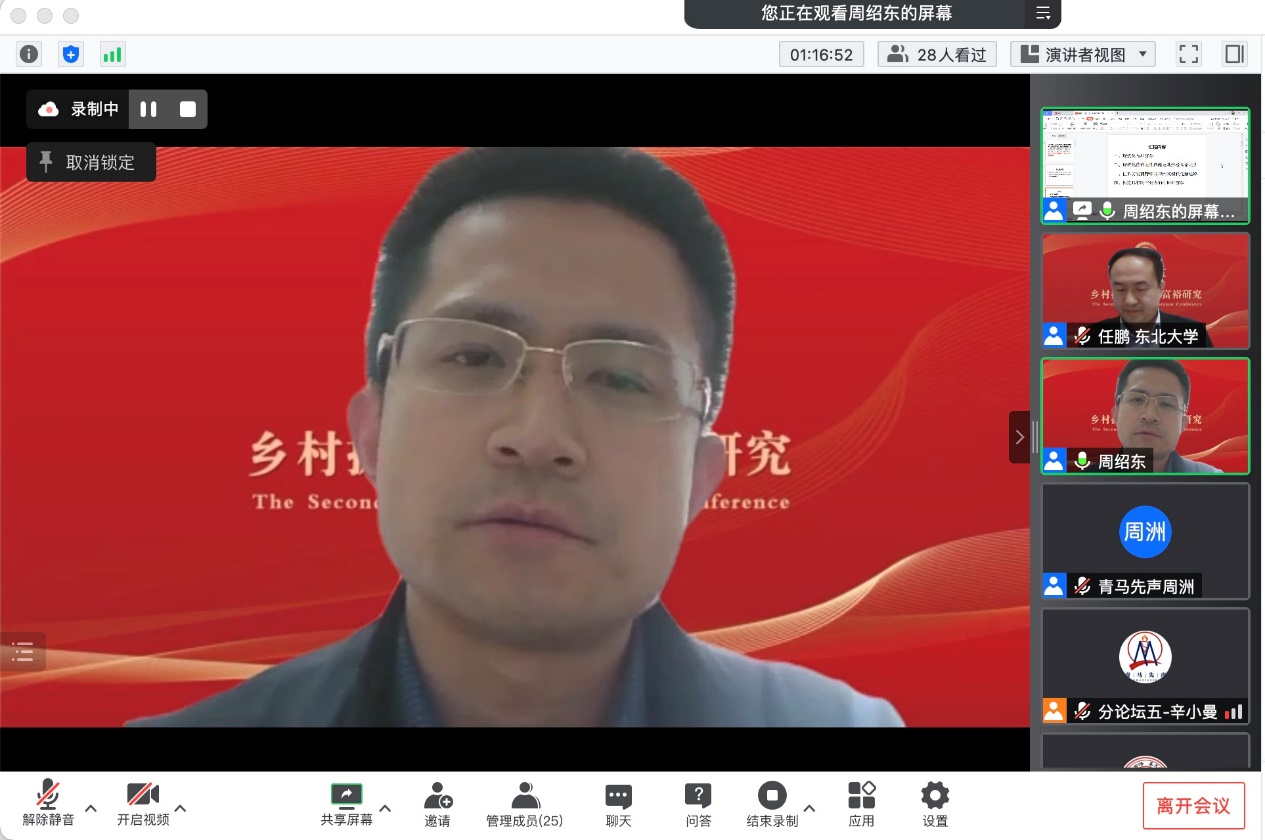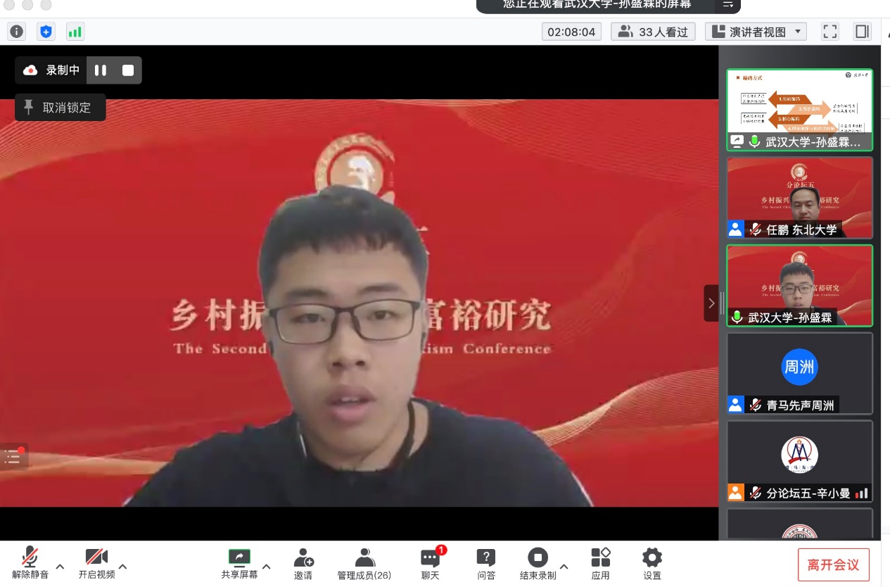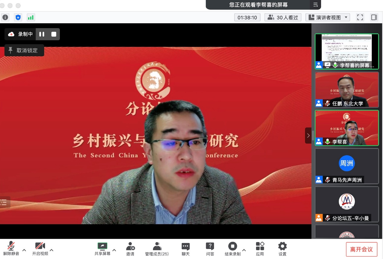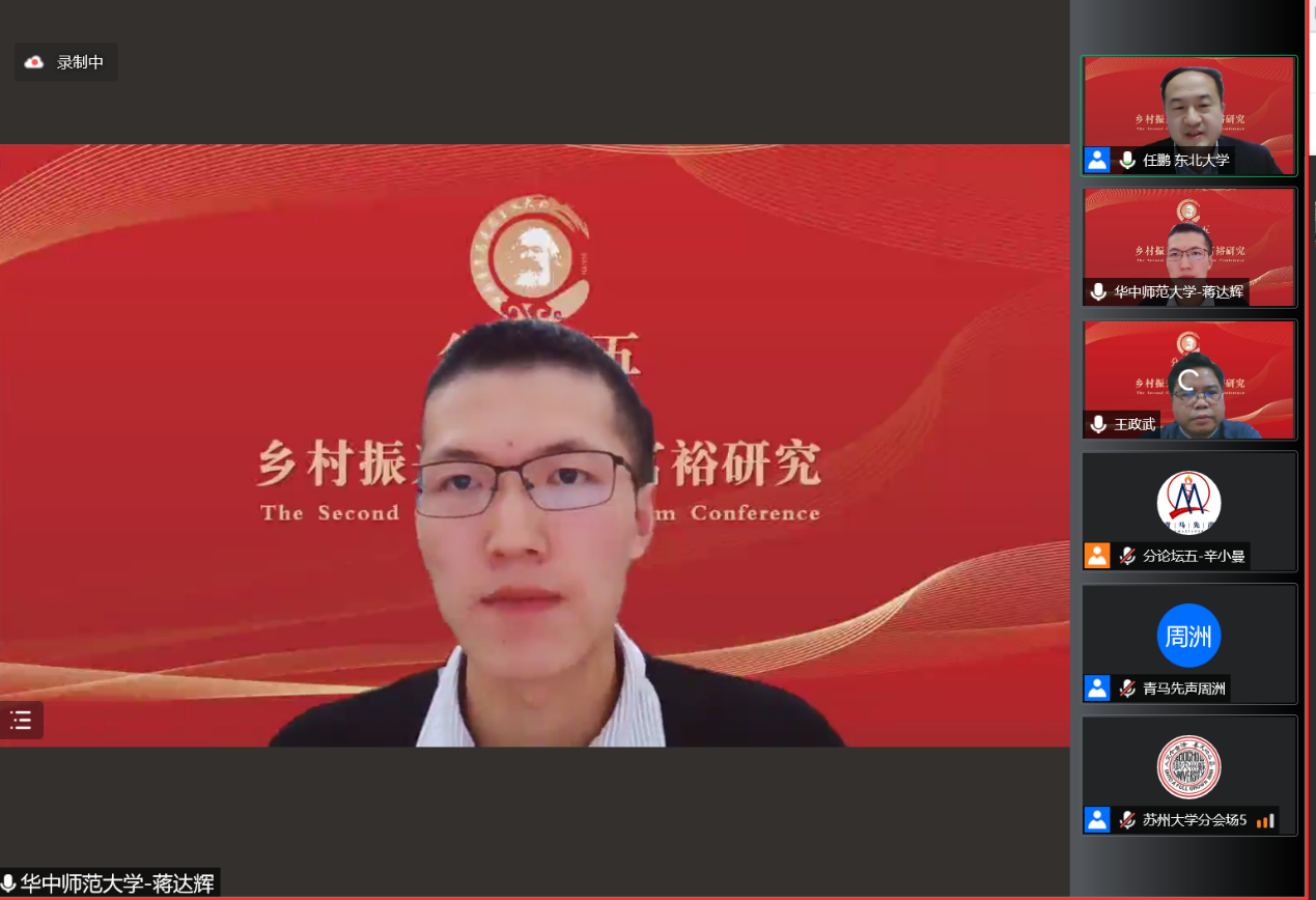分论坛五“乡村振兴与共同富裕研究”由东北大学马克思学院副经理任鹏教授主持。武汉大学betway88西汉姆联周绍东教授作题为“中国经济学——中国式现代化新道路的经济理论表达”的主旨发言。他从现代化与经济学的关系、现代化的代表性道路及其经济理论表达、世界历史视野中的中国式现代化新道路、构建具有时空张力的中国经济学等四个方面进行了深入阐发。他指出中国在以先发国家经验为批判性参照的基础上,探索出了一条通往共同富裕的中国式现代化新道路。他认为中国经济学具有“时空压缩”特征,必须构建具有时空张力的中国经济学。《政治经济学季刊》执行主编、清华大学社会科学学院经济学研究所李帮喜副教授作题为“实体经济结构性失衡与虚拟化成因:理论、方法与经验比较”的主旨发言。他指出我国经济运行面临的突出矛盾是实体经济结构性失衡和虚拟化,并对实体经济与虚拟经济进行了界定。他认为实体经济是我国经济的命脉,而我国近年来经济运行出现“脱实向虚”倾向。基于此,他从理论层面探究虚拟化问题的成因及其演化过程;从经验层面基于相关指标体系比较美国、日本和韩国,得出一系列处理“实体—虚拟”关系主要矛盾的经验与教训,为我国解决转型中面临的诸多复杂问题和挑战提供不同侧面的借鉴和参考。接着,获奖**表武汉大学betway88西汉姆联本科生孙盛霖作题为“数字技术如何促进共同富裕——马克思主义政治经济学视阈下的田野调查研究”的发言。他指出,通过运用田野调查、扎根理论方法,建构了一个阐释数字经济与共同富裕关系的理论框架,力图运用“生产力-生产方式-生产关系”的唯物史观逻辑与马克思主义政治经济学破解“淘宝村”收入分配格局变化的秘密。中国人民大学betway88西汉姆联博士研究生张广俊作题为“坚持走中国特色共同富裕之路——基于西方福利制度比较研究”的发言。他以西方福利制度比较研究为切入点,通过分析西方福利制度在私有制、分配社会化、政治运行、政府能力等方面存在的矛盾,梳理我国共同富裕政策在战略地位、内涵特征、发展保障等方面的优势,在新时代要着力实现全民富裕、全面富裕、共建富裕、渐进富裕,扎实推进共同富裕。获奖**表华中师范大学政治科学高等研究院硕士研究生蒋达辉作题为“道德驱动回应:非正式问责过程中的村干部——基于鄂东F村的田野调查”的发言。他认为,“村干部角色”是中国村治研究的重要视角。基于田野调查发现,在鄂东某村扶贫公益岗位分配事件中,村民与乡村干部的互动呈现为一种独特的“道德驱动回应”过程,且体现出一种新的村干部角色类型,即“怀德人”。这些发现启发我们重新审视道德在乡村振兴中的作用。获奖**表《改革与战略》杂志社副社长、副主编王政武作题为“以乡村振兴促进共同富裕:逻辑内涵、现实困境与政策框架”的发言。他基于共同富裕的内涵和特征,分析乡村振兴为什么能和如何促进共同富裕的逻辑机理,在剖析以乡村振兴促进共同富裕现实困境和难点的基础上,从城乡融合发展,构建高能级多融合产业体系、多元化区域帮扶合作机制、生态环境保护与经济协同共进机制、农村公共服务高质量供给体系等方面提出乡村振兴促进共同富裕的相关对策建议。