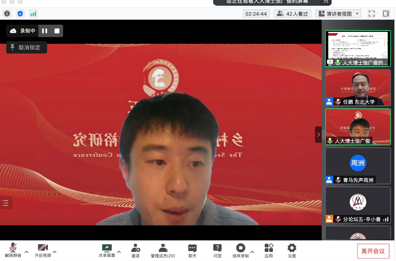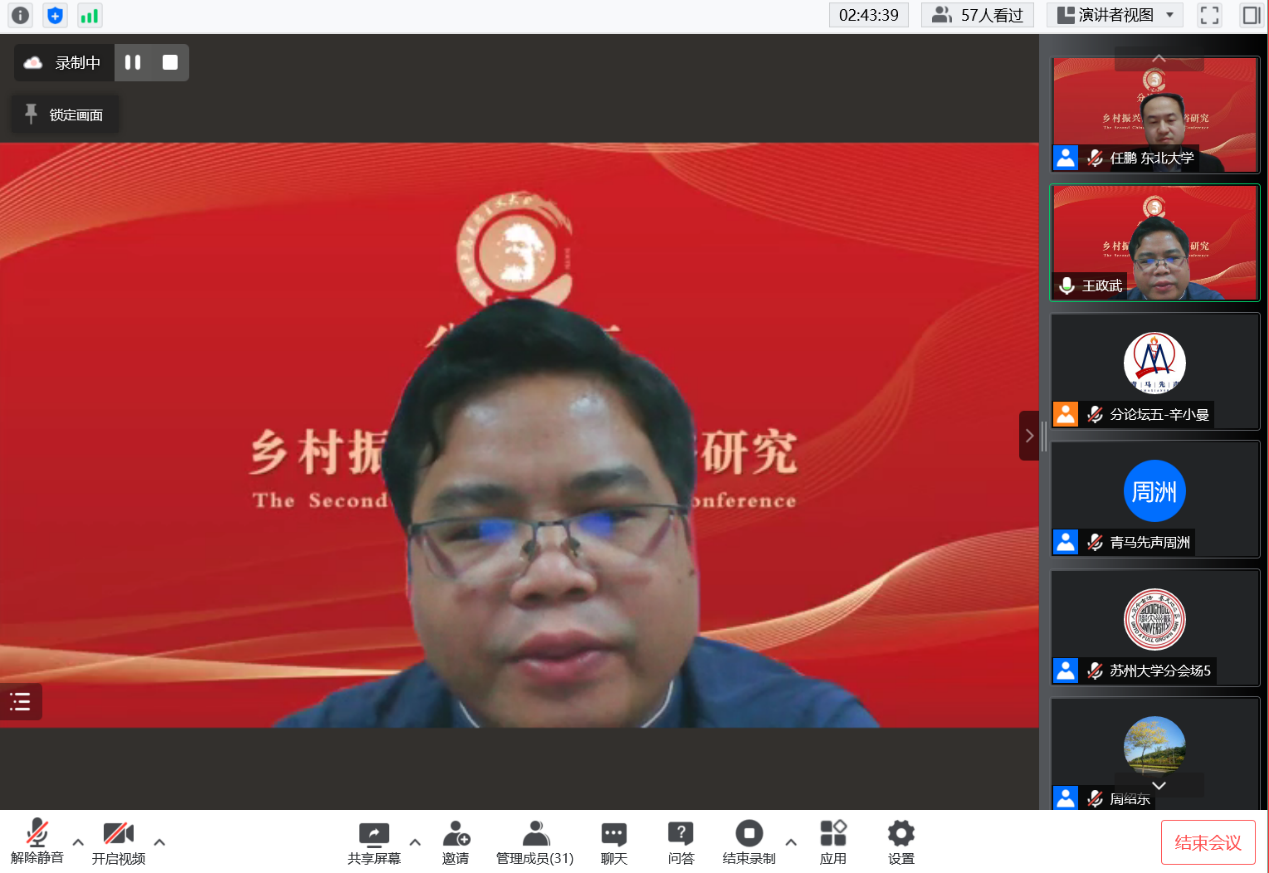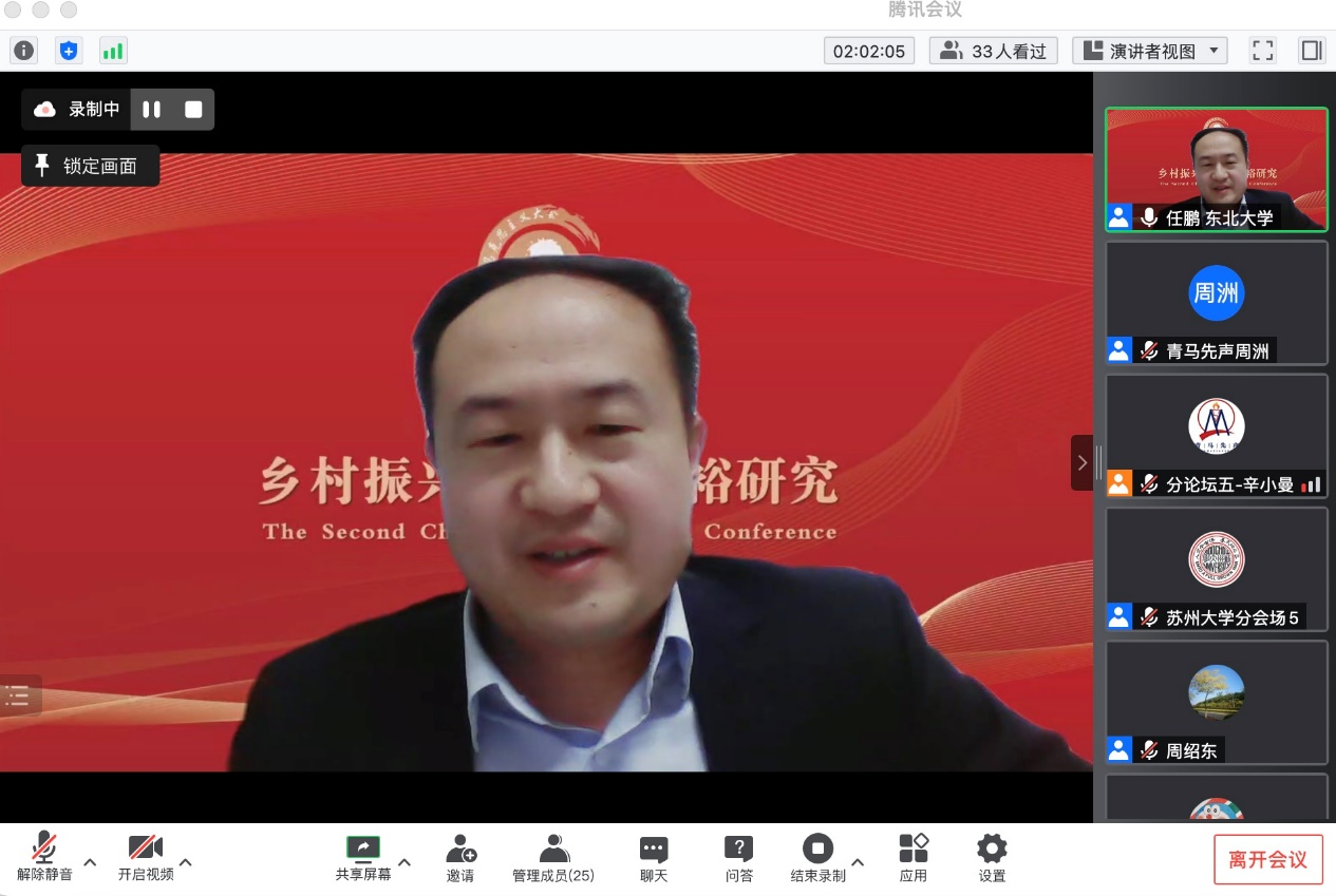 分论坛五“乡村振兴与共同富裕研究”由东北大学马克思学院副经理任鹏教授主持。武汉大学betway88西汉姆联周绍东教授作题为“中国经济学——中国式现代化新道路的经济理论表达”的主旨发言。他从现代化与经济学的关系、现代化的代表性道路及其经济理论表达、世界历史视野中的中国式现代化新道路、构建具有时空张力的中国经济学等四个方面进行了深入阐发。他指出中国在以先发国家经验为批判性参照的基础上,探索出了一条通往共同富裕的中国式现代化新道路。他认为中国经济学具有“时空压缩”特征,必须构建具有时空张力的中国经济学。《政治经济学季刊》执行主编、清华大学社会科学学院经济学研究所李帮喜副教授作题为“实体经济结构性失衡与虚拟化成因:理论、方法与经验比较”的主旨发言。他指出我国经济运行面临的突出矛盾是实体经济结构性失衡和虚拟化,并对实体经济与虚拟经济进行了界定。他认为实体经济是我国经济的命脉,而我国近年来经济运行出现“脱实向虚”倾向。基于此,他从理论层面探究虚拟化问题的成因及其演化过程;从经验层面基于相关指标体系比较美国、日本和韩国,得出一系列处理“实体—虚拟”关系主要矛盾的经验与教训,为我国解决转型中面临的诸多复杂问题和挑战提供不同侧面的借鉴和参考。接着,获奖**表武汉大学betway88西汉姆联本科生孙盛霖作题为“数字技术如何促进共同富裕——马克思主义政治经济学视阈下的田野调查研究”的发言。他指出,通过运用田野调查、扎根理论方法,建构了一个阐释数字经济与共同富裕关系的理论框架,力图运用“生产力-生产方式-生产关系”的唯物史观逻辑与马克思主义政治经济学破解“淘宝村”收入分配格局变化的秘密。中国人民大学betway88西汉姆联博士研究生张广俊作题为“坚持走中国特色共同富裕之路——基于西方福利制度比较研究”的发言。他以西方福利制度比较研究为切入点,通过分析西方福利制度在私有制、分配社会化、政治运行、政府能力等方面存在的矛盾,梳理我国共同富裕政策在战略地位、内涵特征、发展保障等方面的优势,在新时代要着力实现全民富裕、全面富裕、共建富裕、渐进富裕,扎实推进共同富裕。获奖**表华中师范大学政治科学高等研究院硕士研究生蒋达辉作题为“道德驱动回应:非正式问责过程中的村干部——基于鄂东F村的田野调查”的发言。他认为,“村干部角色”是中国村治研究的重要视角。基于田野调查发现,在鄂东某村扶贫公益岗位分配事件中,村民与乡村干部的互动呈现为一种独特的“道德驱动回应”过程,且体现出一种新的村干部角色类型,即“怀德人”。这些发现启发我们重新审视道德在乡村振兴中的作用。获奖**表《改革与战略》杂志社副社长、副主编王政武作题为“以乡村振兴促进共同富裕:逻辑内涵、现实困境与政策框架”的发言。他基于共同富裕的内涵和特征,分析乡村振兴为什么能和如何促进共同富裕的逻辑机理,在剖析以乡村振兴促进共同富裕现实困境和难点的基础上,从城乡融合发展,构建高能级多融合产业体系、多元化区域帮扶合作机制、生态环境保护与经济协同共进机制、农村公共服务高质量供给体系等方面提出乡村振兴促进共同富裕的相关对策建议。