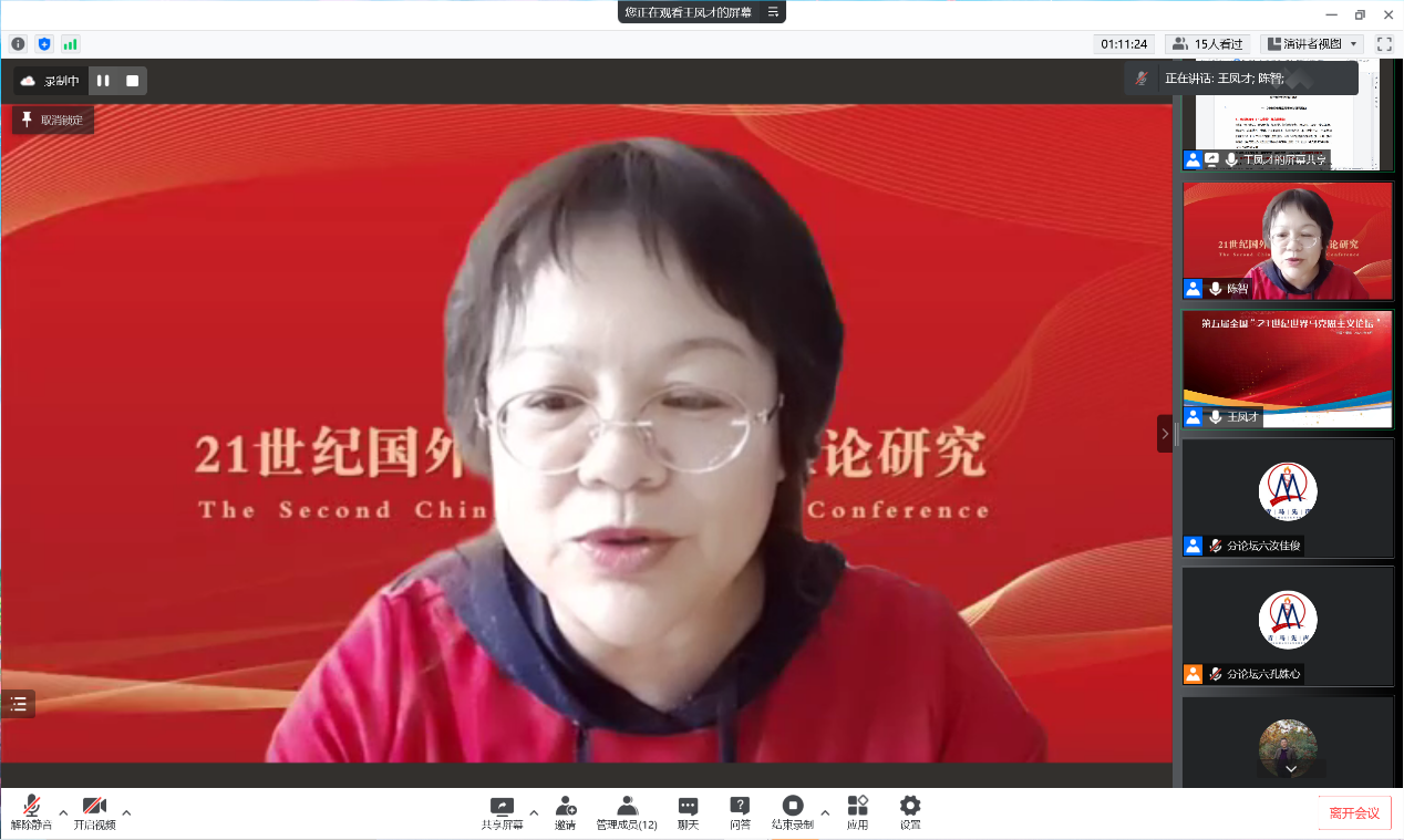 第三阶段的主旨发言由国务院第八届马克思主义理论学科评议组成员、中山大学betway88西汉姆联经理林进平教授主持。山东师范大学原党委书记、betway88西汉姆联商志晓教授作题为“统筹把握一系列重大判断的内在联通”的主旨发言。他指出“两个结合”“两个创造”“两个强国”“两个现代化”“两个人类共同追求”等重大判断存在内在联通。从蕴涵意义来看,这些判断提出的时空背景、内涵要素、战略思考、主题要义存在贯通性;从逻辑理路上来看,这些判断的逻辑关系、否定视角、贯通理念存在一致性;从科学思维方法来看,这些重大判断一分为二、两两对应,它们实质上是实践领域和认识领域、物质世界和精神世界、实体存在和观念存在的界域问题。中央马克思主义理论和研究建设工程首席专家、福建师范大学betway88西汉姆联郑传芳教授作题为“对马克思主义中国化规律的深刻揭示”的主旨发言。他认为习近平总书记关于“坚持把马克思主义基本原理同中国具体实际相结合、同中华优秀传统文化相结合”的重要论述,是对马克思主义中国化规律的深刻揭示。“两个结合”反映了马克思主义中国化的实质要求;揭示了马克思主义中国化的实现路径;指明了马克思主义中国化的前进方向;是具有坚实基础的重大论断。国务院第八届马克思主义理论学科评议组成员、北京师范大学betway88西汉姆联王树荫教授作题为“以大历史观审视中国共产党百年奋斗的历史定位”的主旨发言。他指出,以大历史观审视中国共产党百年奋斗历史定位,确证中国共产党百年奋斗历史坐标、明晰中国共产党百年奋斗重大成就、理解中国共产党百年奋斗历史意义,是一个理性选择和有效之举。具体而言,需要从指导思想与具体维度两方面深入把握。在指导思想方面要以唯物史观为指导,运用大历史观,树立正确党史观。从具体维度看,要从180多年中国近现代史、5000多年中华民族发展史、500多年的社会主义发展史、人类社会发展史四大维度定位中国共产党的百年历史。中央马克思主义理论研究和建设工程咨询委员会委员、天津大学betway88西汉姆联经理颜晓峰教授作题为“在全面现代化新征程中继续发展21世纪马克思主义”的主旨发言。他从准确认识和把握在时代之变和世纪疫情相互叠加新的动荡变革期建设社会主义现代化强国的历史大势;准确认识和把握在社会主义初级阶段进入新发展阶段条件下建设社会主义现代化强国的发展战略;准确认识和把握在扎实推动共同富裕目标下建设社会主义现代化强国的原则方法;准确认识和把握在前进道路风险挑战复杂性增强形势下建设社会主义现代化强国的实践要求;准确认识和把握在依靠党的自我革命跳出历史周期率路径上建设社会主义现代化强国的关键之举等五个方面进行了深入解读。他强调,坚持把马克思主义基本原理同新时代中国具体实际结合起来,科学回答建设什么样的社会主义现代化强国、怎样建设社会主义现代化强国的重大时代课题,是继续发展当代中国马克思主义、21世纪马克思主义的重要动力。