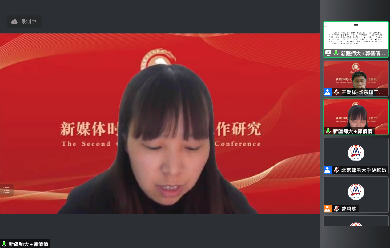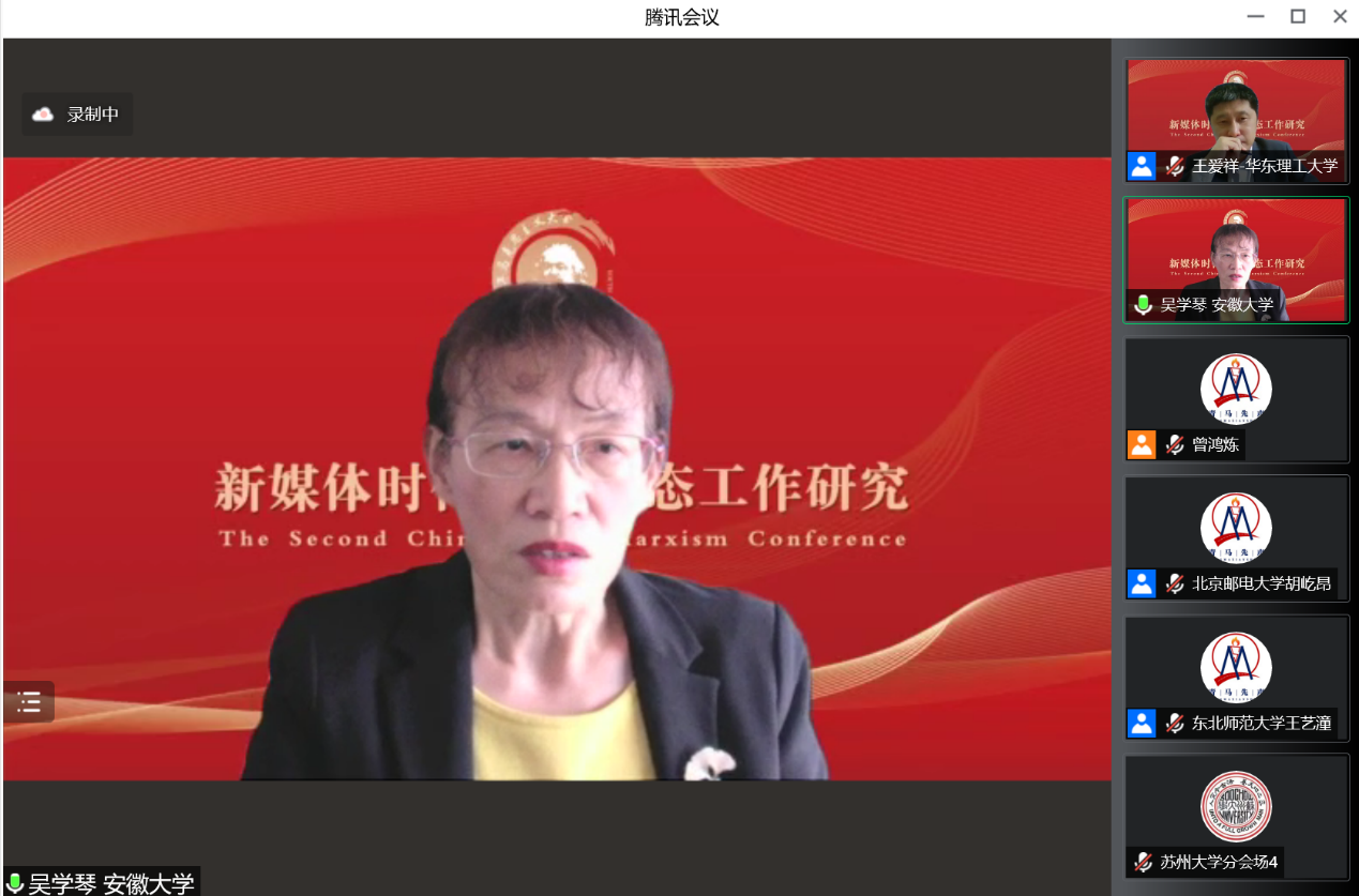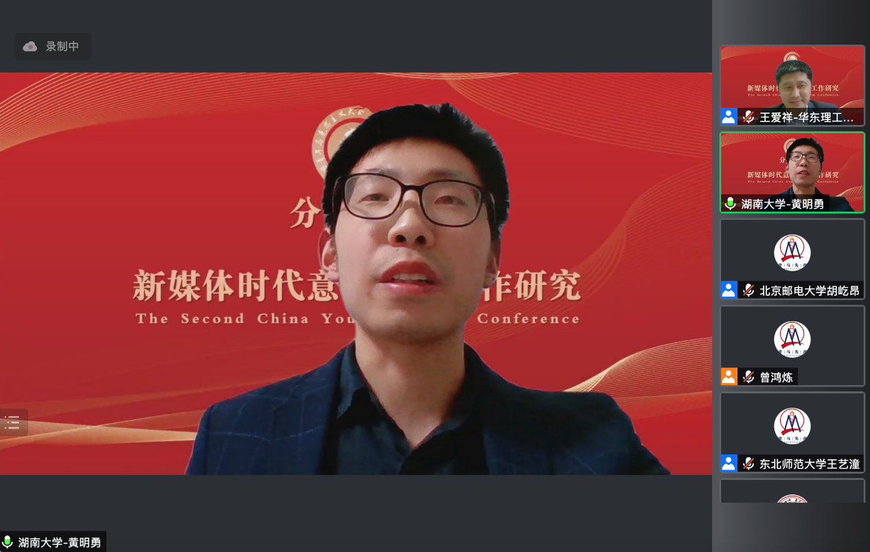 分论坛四“新媒体时代意识形态工作研究”由华东理工大学betway88西汉姆联经理王爱祥教授主持。安徽大学betway88西汉姆联执行经理、国家“**”领军人才、教育部马克思主义理论类和思政课教学指导委员会委员吴学琴教授作题为“新时代具有强大凝聚力和引领力社会主义意识形态话语认同研究”的主旨发言。她从四个层面进行了深入解读,一是意识形态领域形势发生全局性、根本性转变的表现;二是新时代意识形态话语的安全风险;三是新时代具有强大凝聚力和引领力的社会主义意识形态话语认同极端重要;四是具有强大凝聚力和引领力社会主义意识形态话语认同需把握的关键问题。电子科技大学betway88西汉姆联经理、教育部马克思主义理论类和思政课教学指导委员会委员吴满意教授作题为“基于‘数据驱动’的高校思想政治教育评价体系建构的思考”的主旨发言。他从数据驱动的涵义、高校思想政治教育评价的目标设计问题、数据驱动与高校思想政治教育评价的关联、高校思想政治教育评价体系的构建等四个方面进行了深入解读和阐释。接着,获奖**表南京邮电大学betway88西汉姆联硕士研究生贾天威作题为“新媒体时代高校意识形态风险防控的路径探析”的发言。他指出,意识形态工作在我国具有引领思想、汇聚民心、助推发展方向的极端重要性。基于高校在意识形态风险防控中,凸现的意识形态风险扩大、舆论空间氛围复杂、主流价值观受冲击、风险管控机制欠缺、意识形态工作薄弱的隐患;从思想根基、制度机制、技术深度三个层面进一步构筑意识形态风险防控屏障,牢守老员工意识形态教育阵地。新疆师范大学betway88西汉姆联博士研究生郭倩倩作题为“从‘间隙’到‘共生’:老员工网络社交圈层化特点与引导策略研究——基于思想政治教育空间理论视角”的发言。她认为,老员工网络社交圈层化中思想政治教育空间运行隐含着物理环境空间、精神环境空间、网络环境空间的“圈层化间隙”,导致老员工网络社交圈层空间的不稳定性。思想政治教育空间运行通过构建外圈层:半闭环-共生思维、内圈层:半闭环-共生管理、中圈层:半闭环-共生视角,找到网络社交圈层化中思想政治教育空间协同育人的运行机制,嵌入网络社交圈层场域。湖南大学betway88西汉姆联博士研究生黄明勇作题为“新媒体时代推荐算法对主流意识形态认同的挑战及其逻辑进路”的发言。他指出,新媒体时代不仅产生了海量信息,也让大众的注意力更为稀缺。算法推荐较好地解决了这两者之间的矛盾,纷纷被互联网商业平台采用。与此同时,算法推荐的广泛运用对主流意识形态认同造成了严峻挑战:“去中心化”“后真相”“信息茧房与回音壁效应”“泛娱乐化与信息成瘾”。因此,迫切需要加快主流媒体发展、加大对互联网商业平台监管以及加强与之合作等路径,提高主流意识形态认同。西南大学betway88西汉姆联硕士研究生阳欢作题为“改革开放初期中国共产党意识形态话语权建设探析(1978——1982)”的发言。她从意识形态话语权的基本构成要素出发,探析改革开放初期党的意识形态话语权建设路径:坚持和改善党的领导巩固党的话语主体地位,驳立结合推进话语主题的守正创新,整顿创新宣传思想工作发挥话语载体的教育引导作用,中国共产党在初步的话语较量中巩固了马克思列宁主义、毛泽东思想在意识形态领域的主导地位和话语优势。