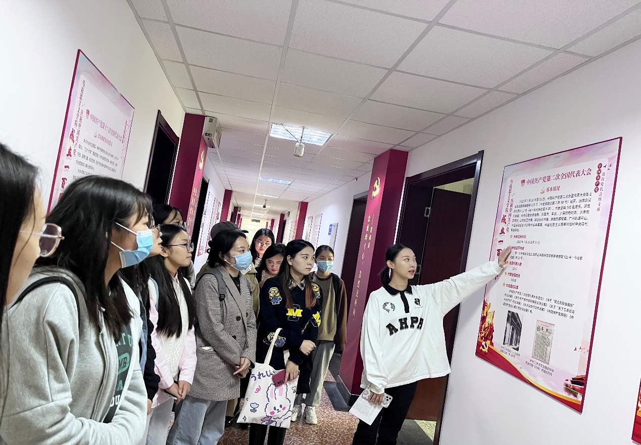李梦瑶、申田歌、王紫荆和张艺可四位同学为新生依次讲解了中国共产党在新民主主义革命时期、社会主义革命和建设时期、改革开放和社会主义现代化建设新时期、中国特色社会主义新时代召开的历次全会概况和取得的成果,全方位、立体化地回顾了党自成立以来的辉煌之路。在展板前,讲解员向同学们强调道:“历史是鉴往知来最好的教科书,党史是治国理政最好的营养剂,是中国共产党自诞生以来领导中国人民为实现中华民族伟大复兴而进行的探索史、奋斗史、创业史,是全体中国人民智慧的结晶。”