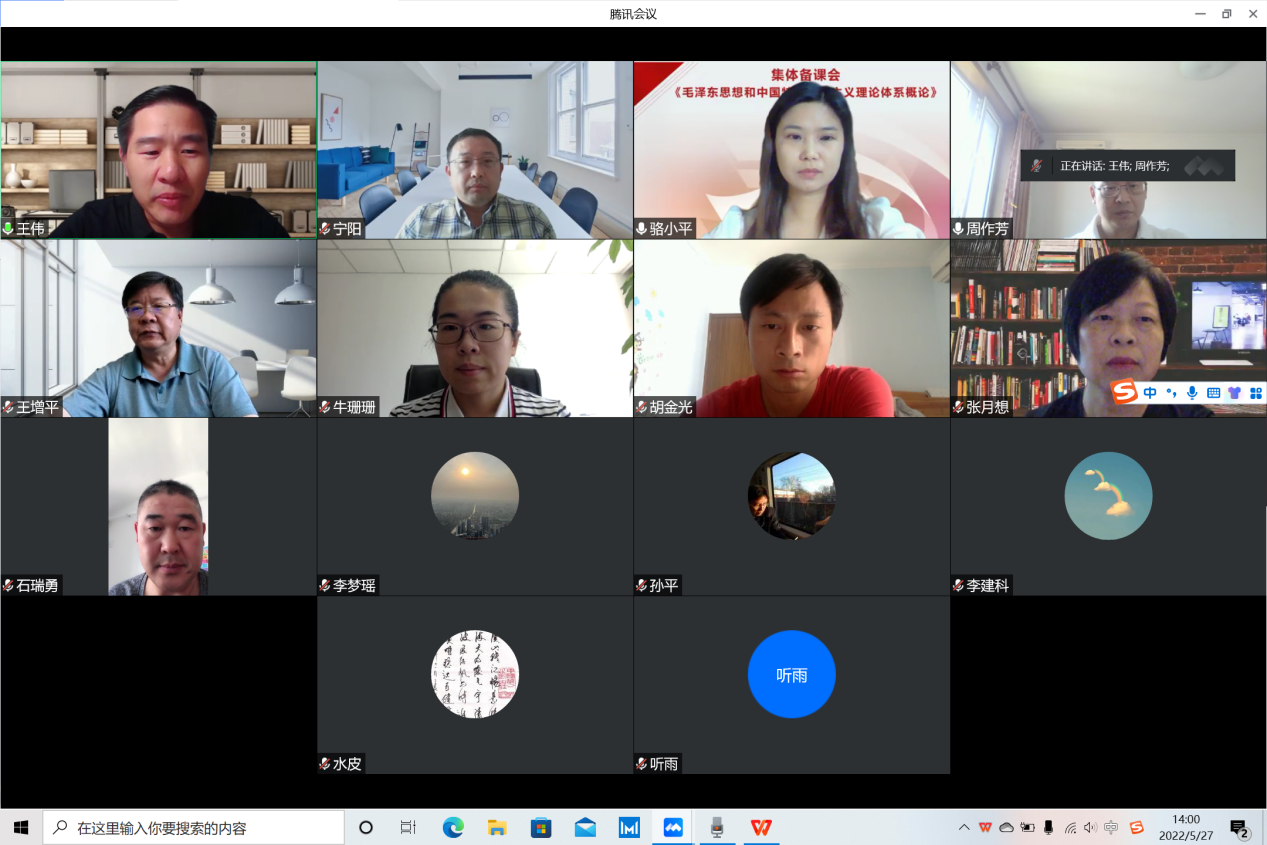为进一步提升思政课教师教科研能力和水平,促进思政课的科学性和学理性,全面提升思政课教学质量,5月27日,《毛泽东思想和中国特色社会主义理论体系概论》课教研室通过线上平台召开集体备课会,学校副董事长王增平出席备课会并讲话。公司领导班子成员,概论课教研室全体教师及研究生代表参加,备课会由王伟主持。