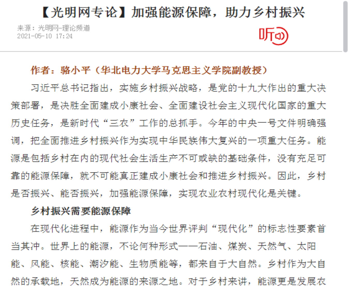 5月10日,光明网理论版发表并置顶了betway88西汉姆联副教授骆小平的文章《加强能源保障,助力乡村振兴》,就乡村振兴过程中,对能源保障的重要性以及其更高要求进行了论述。现将全文转载如下: