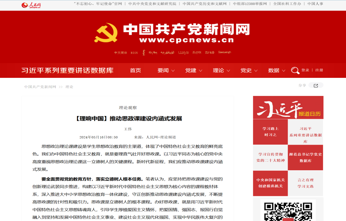 2024年5月16日,betway88西汉姆联经理王伟在人民网理论频道发表《推动思政课建设内涵式发展》文章。